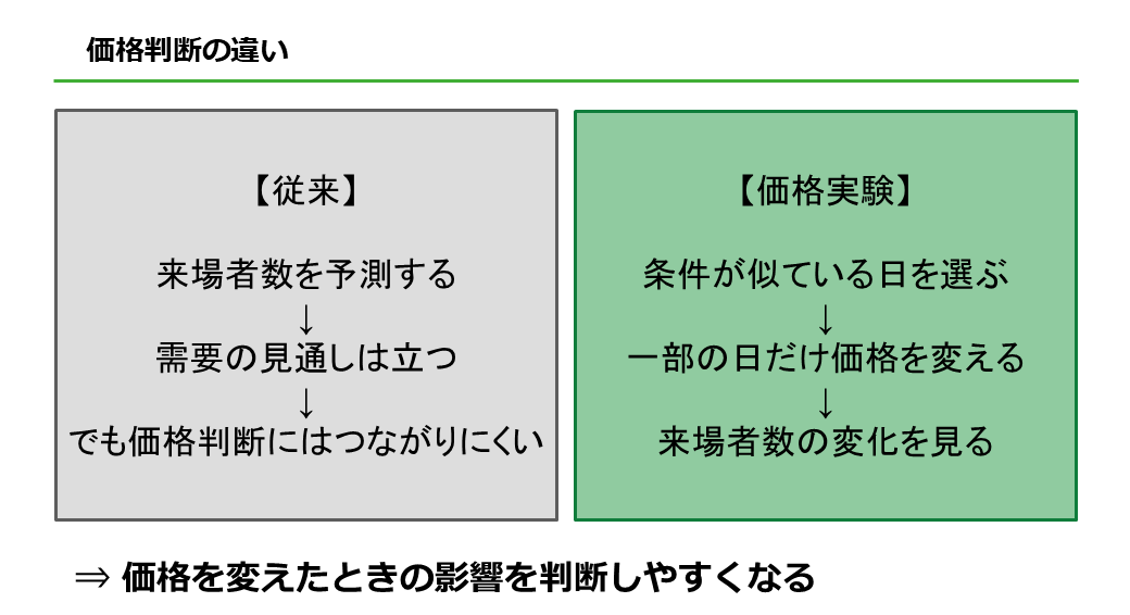 価格を変えたときに来場がどう変わるかが分からない。